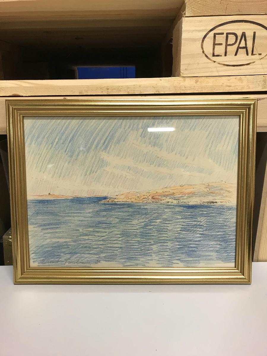 Inramad teckning i färg föreställande kustlandskap med himmel och hav.