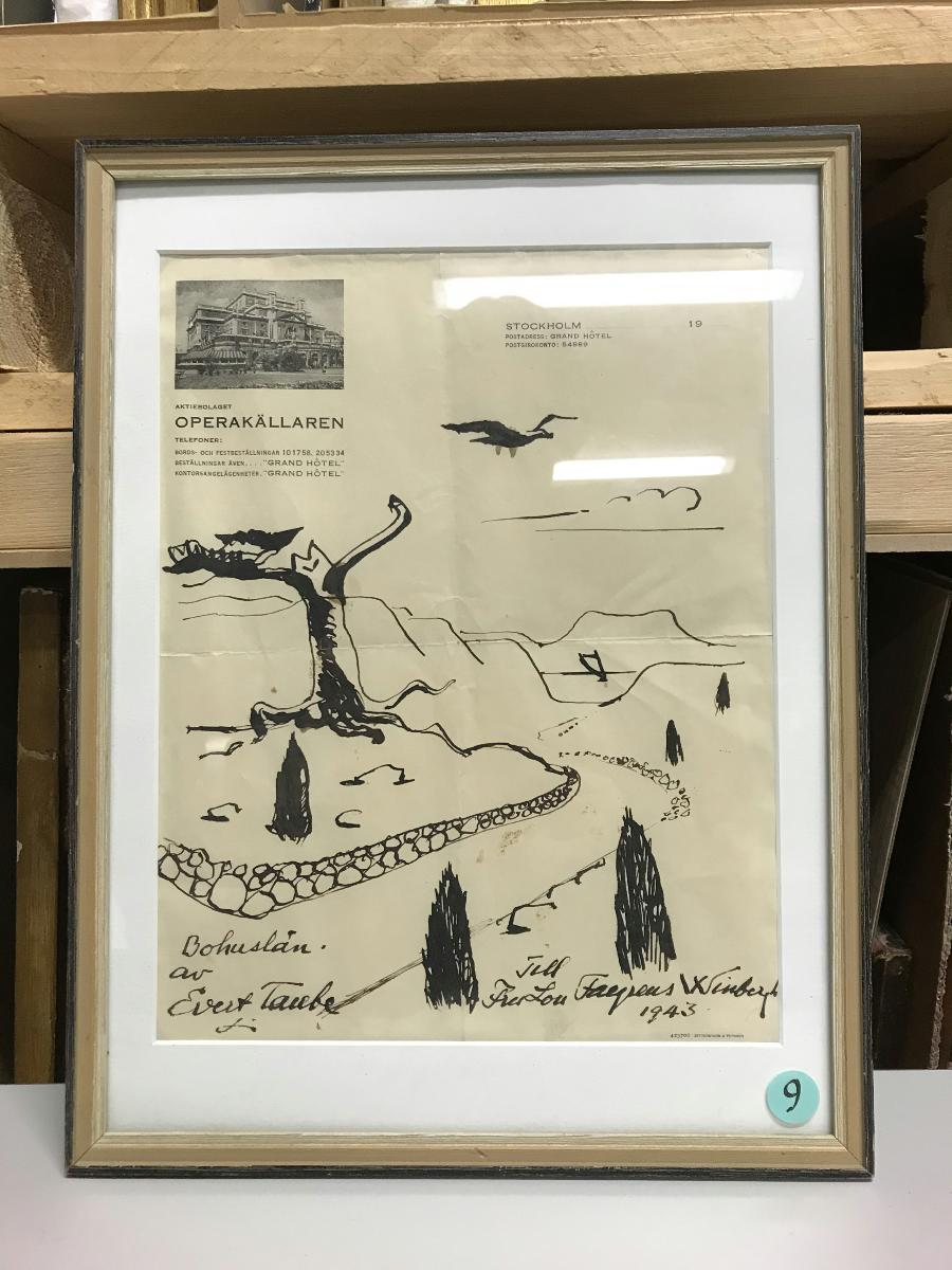 Inramad teckning föreställande ett bohuslänskt landskap med träd, stenmur, segelbåt, en väg och enar. Utförd i tusch på Operakällarens brevpapper.