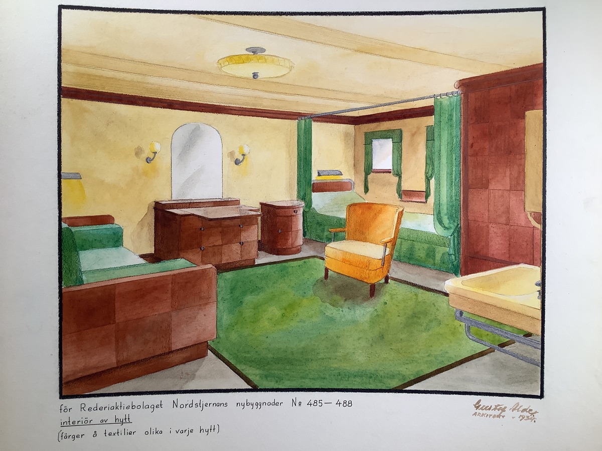 Ritning, förslag till interiör av matsalong i Rederiaktiebolaget Nordstjernans nybyggen vid Götaverken med nybyggnadsnummer. 485 - 488. Ritad av arkitekt Gustaf Alde 1934.
