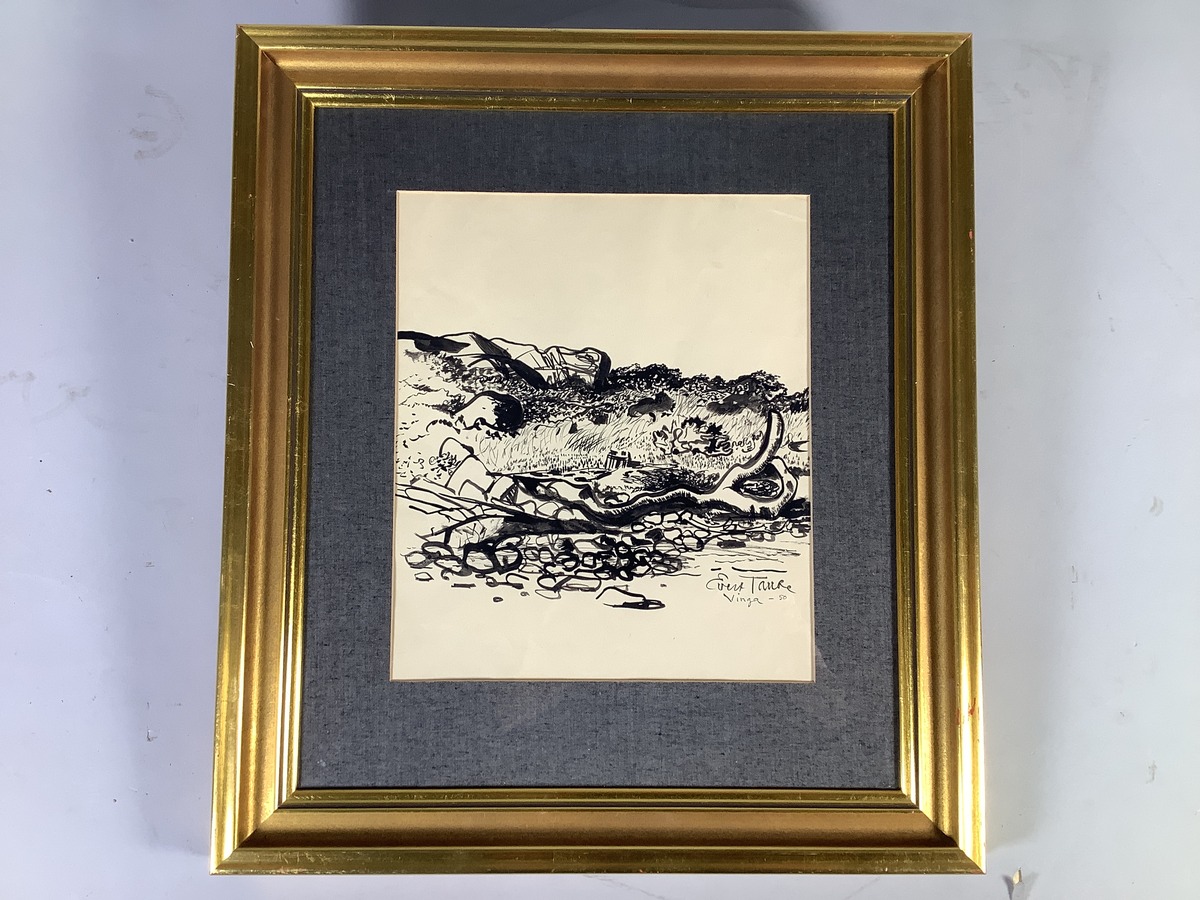 Inramad tuschteckning föreställande landskapet på Vinga.