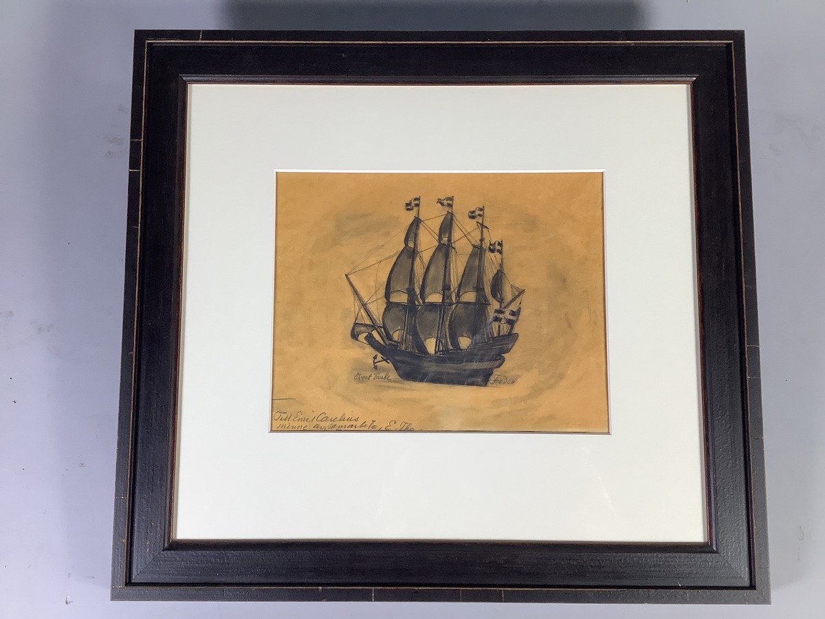 Inramad blyertsteckning föreställande ett segelskepp FREDEN.