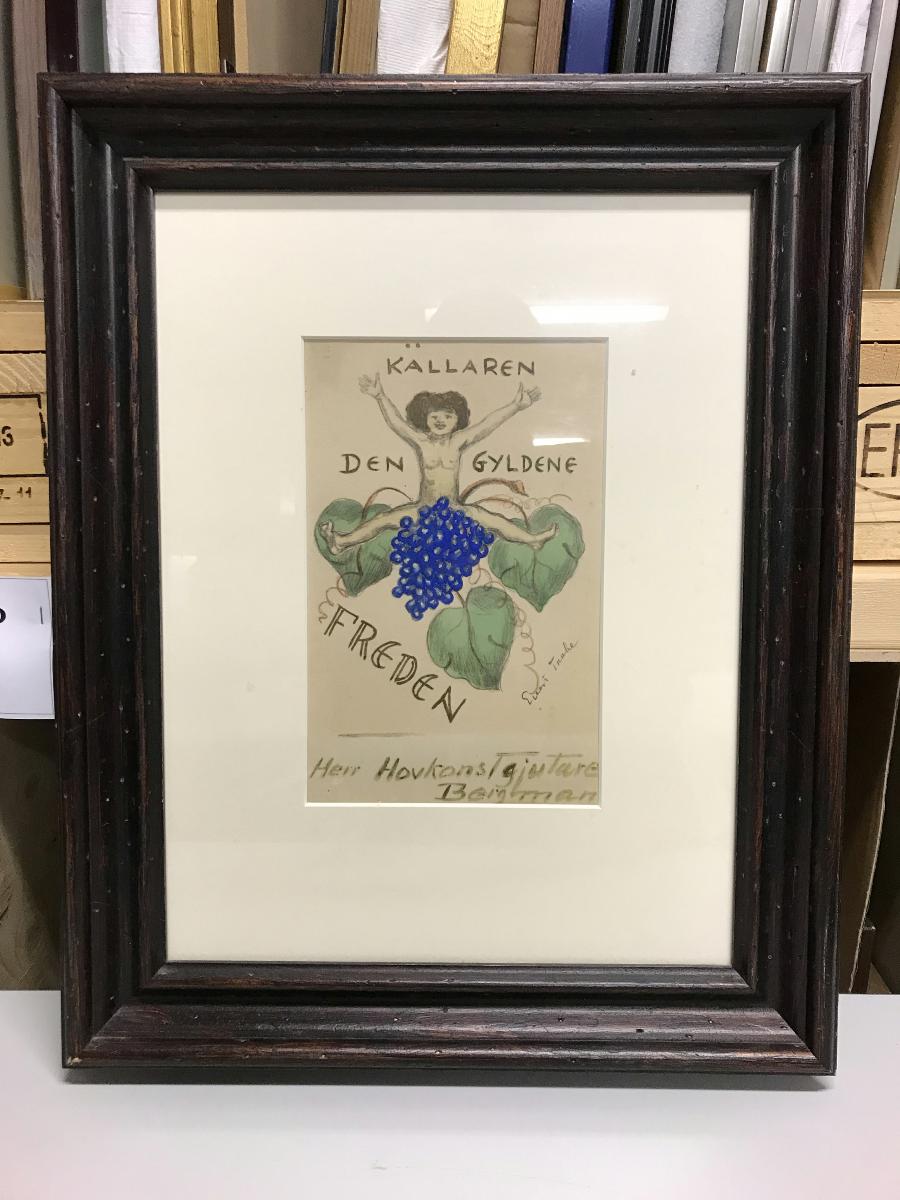 Inramad matsedel föreställande en nacken kvinna sittandes på en klase vindruvor.