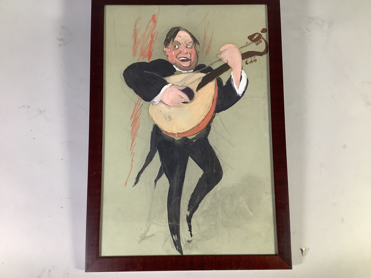 Inramad temperamålning föreställer en man i frack som spelar luta och dansar. Evert har målat lutsångaren Gunnar Bohman.