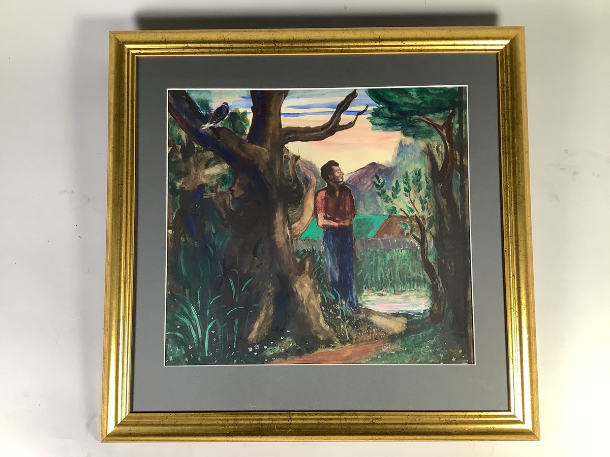 Inramad målning på papper föreställande Taube i grönskan.