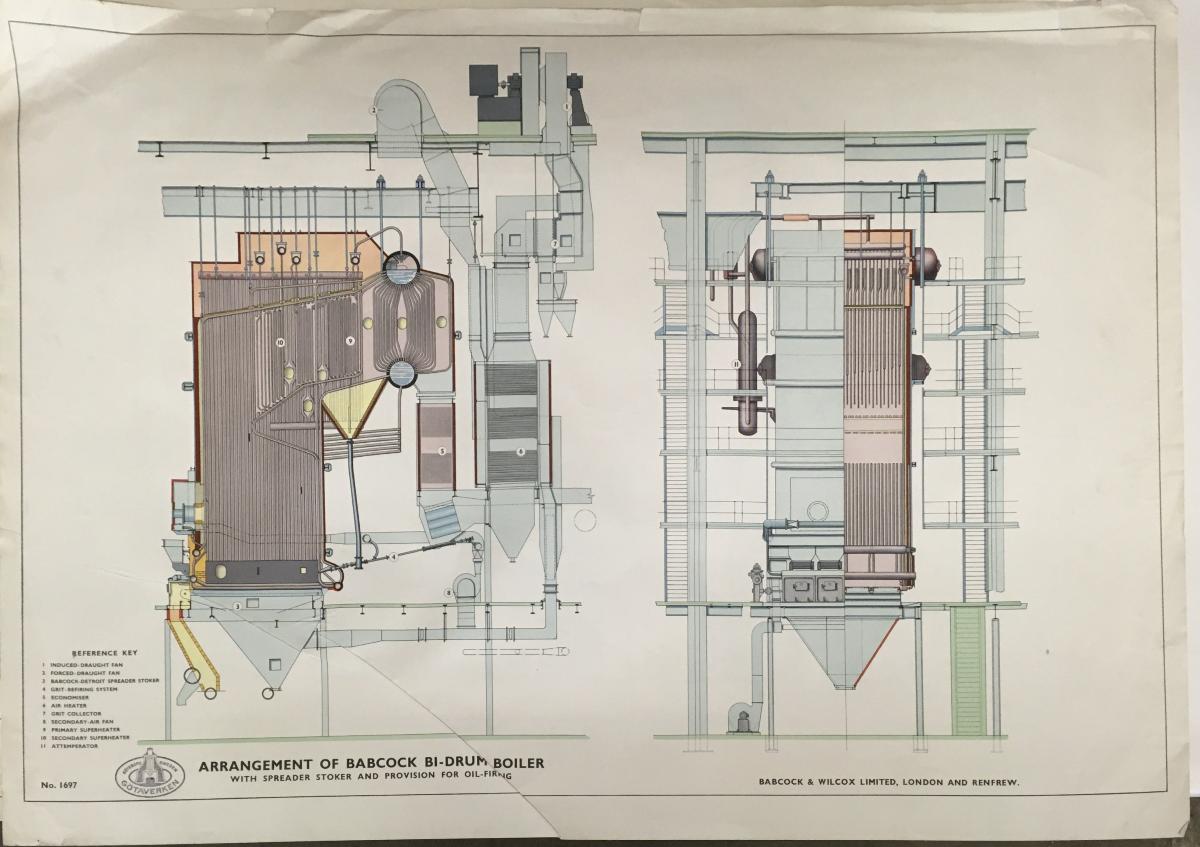 Maskinritning för reklambruk, Götaverken. Titeln på engelska 'Arrangement of Babcock Bi-Drum Boiler' No.1697. Ritad och tryckt av Babcock & Wilcox Limited, London and Renfrew (Skottland).