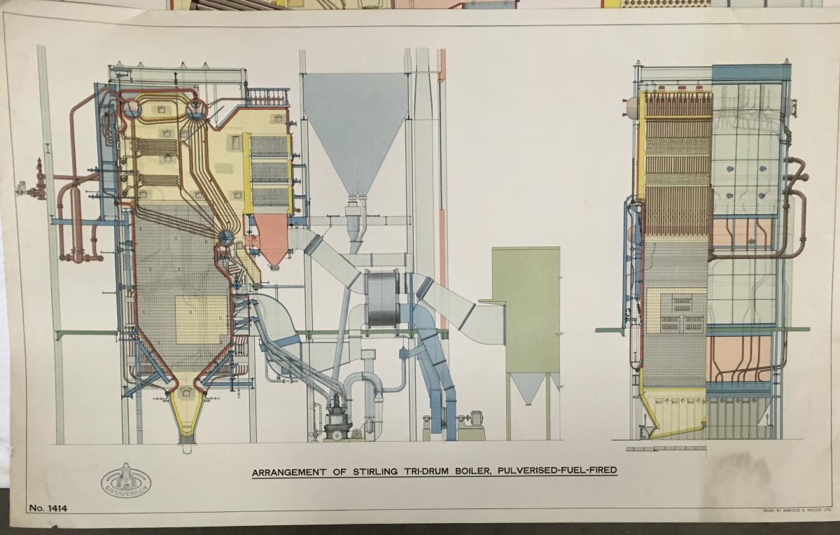Maskinritning för reklambruk, Götaverken. Titeln på engelska 'Arrangement of Stirling Tridum Boiler, Pulverised-Fuel Fired' No.1414. Ritad och tryckt av Babcock & Wilcox Limited, London and Renfrew (Skottland).