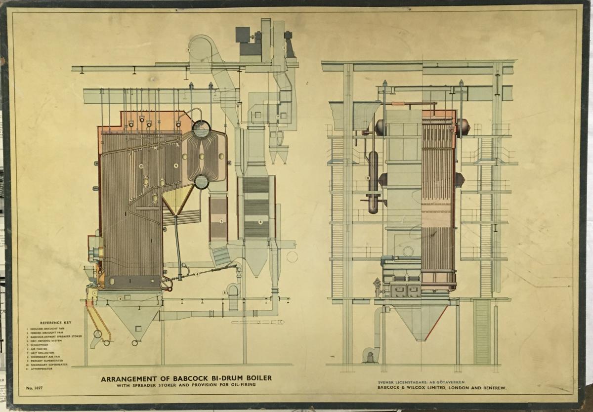 Maskinritning för reklambruk på kartong och textil, Götaverken. Titeln är på engelska 'Arrangement of Babcock Bi-Drum Boiler' No.1697.