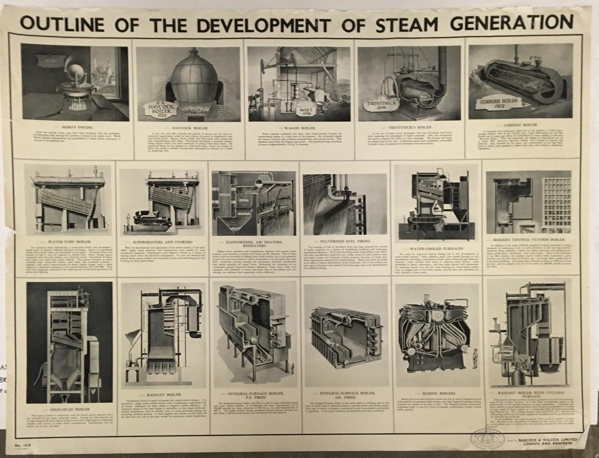 Plansch ånggeneratorer för reklambruk, Götaverken. Titeln är på engelska 'Outline of the Development of Steam Generation' No.1418 med några bilder av ångmaskiner.