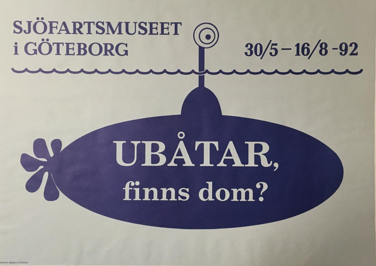 Utställnings affisch till 'Ubåtar, finns dom?' Sjöfartsmuseet i Göteborg, 30/5 - 16/8 -1992 illustrationer av Malena Orstadius.
