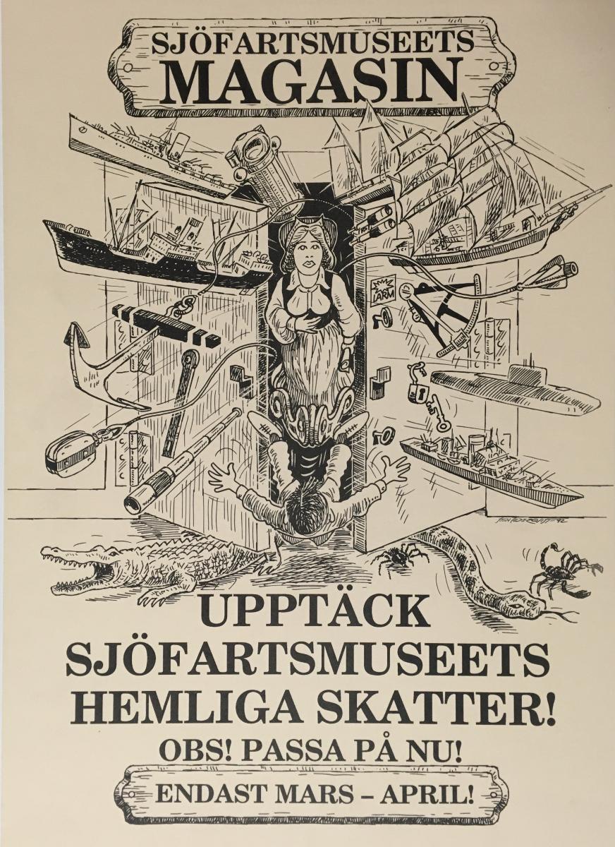 Utställnings affisch till 'Upptäck Sjöfartsmuseets hemliga skatter' Sjöfartsmuseet i Göteborg Endast mars - april.