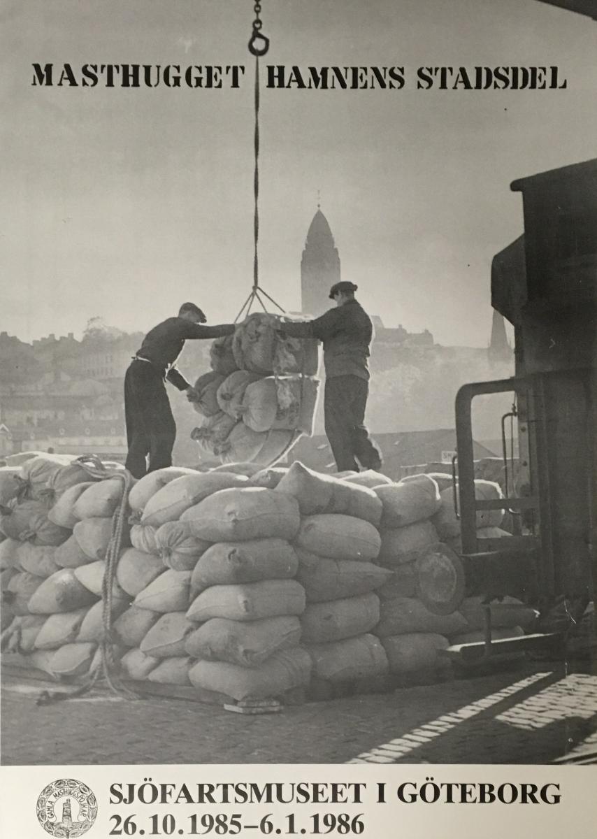 Utställnings affisch till 'Masthugget hamnens stadsdel' Sjöfartsmuseet i Göteborg, 26.10.1985 - 6-1-1986.