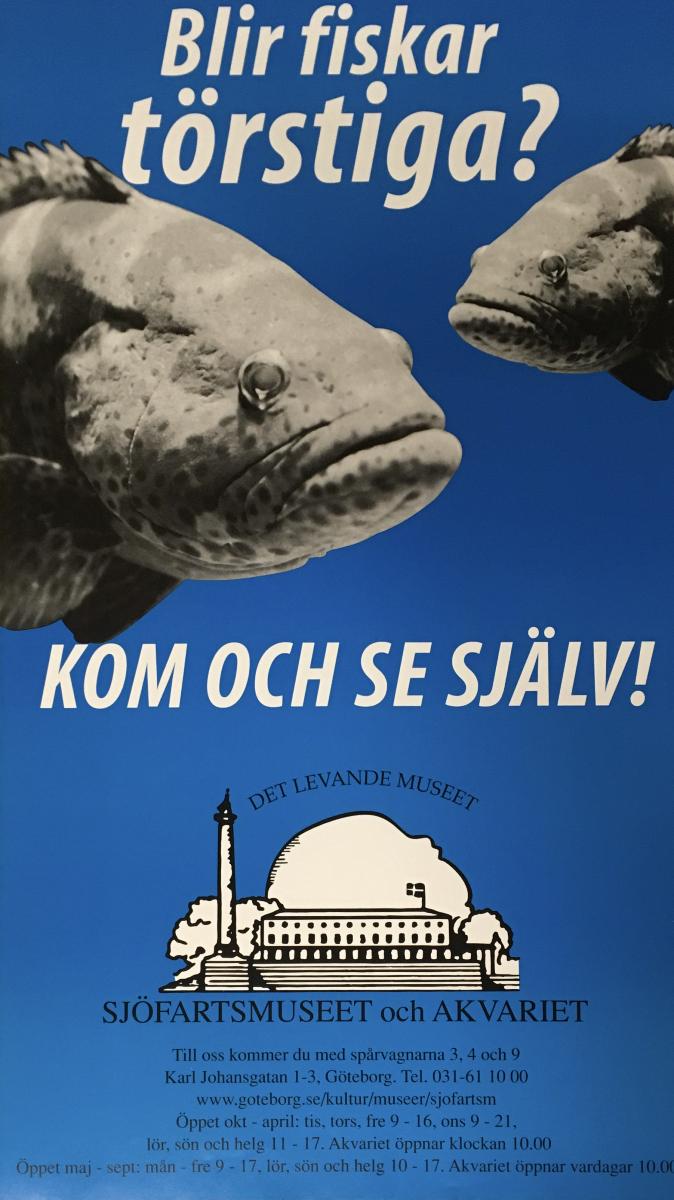 Utställnings affisch till Sjöfartsmuseet och Akvariet, Göteborg, 'Blir fiskar törstiga? Kom och se själv!'