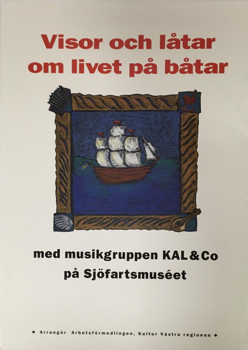 Utställnings affisch till 'Visor och låtar om livet på båtar med musikgruppen KAL & co' Sjöfartsmuseet i Göteborg. Arrangör Arbetsförmedlingen, kultur Västra regionen.