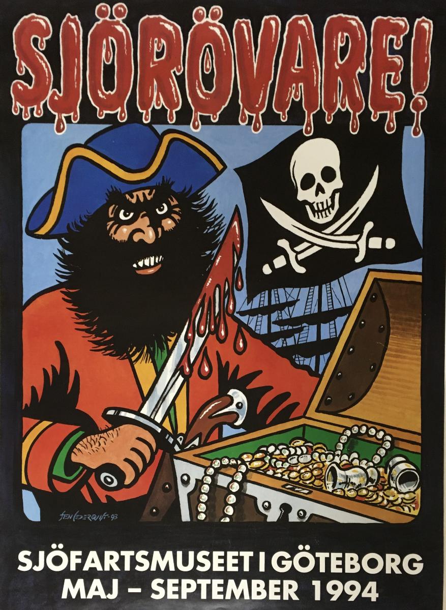 Utställnings affisch till 'Sjörövare!' Sjöfartsmuseet i Göteborg. Maj - september 1994. Med bild av Sten Cederqvist 1994.