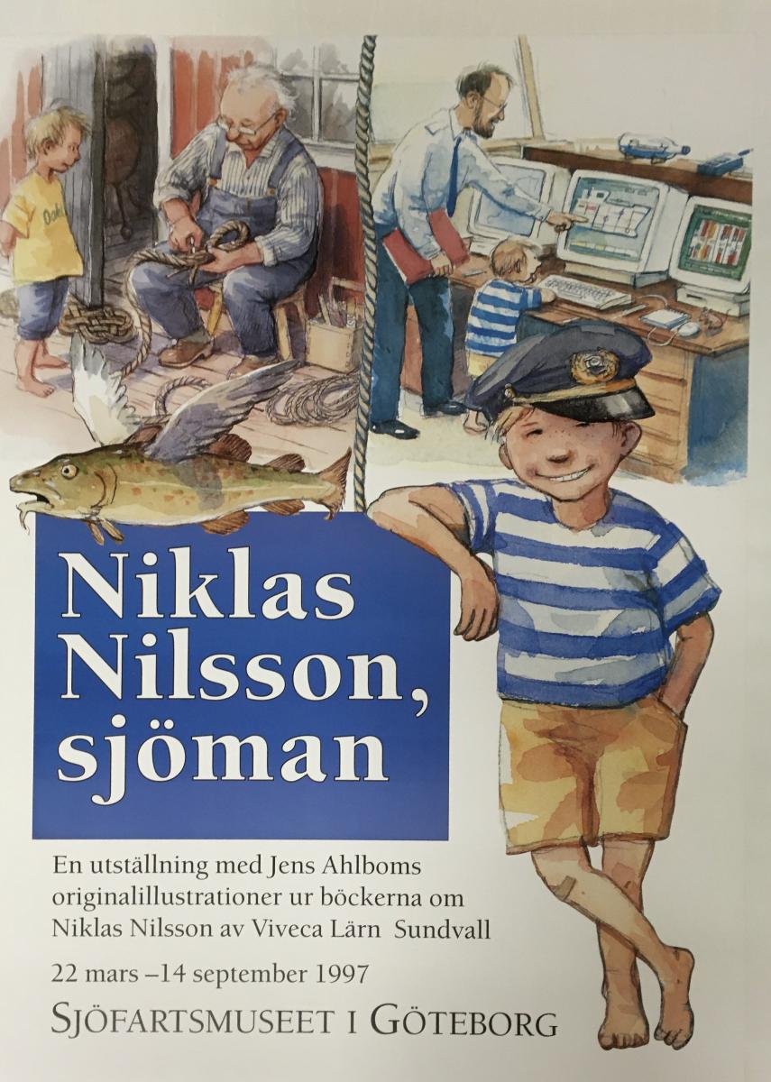 Utställningsaffisch till 'Niklas Nilsson, sjöman - en utställning med Jens Ahlboms originalillustrationer ur böckerna om Niklas Nilsson av Viveca Lärn Sundvall' Sjöfartsmuseet i Göteborg. 22 mars- 14 september 1997.
