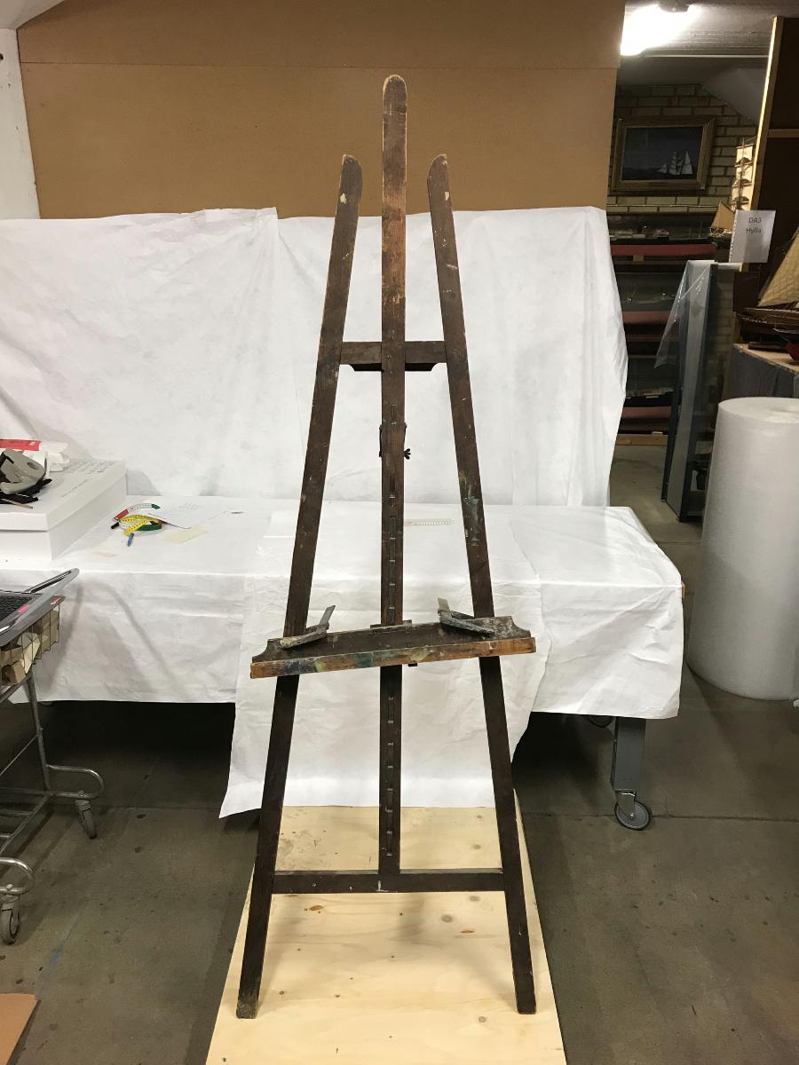 Staffli. Något skadat så två tvingar håller uppe hyllan där man ställer duken.