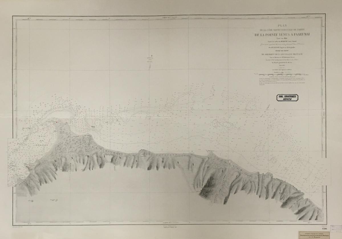 Sjökort Plage de la Pointe Venus, Tahiti, 1852. På franska 'de la pointe venus'