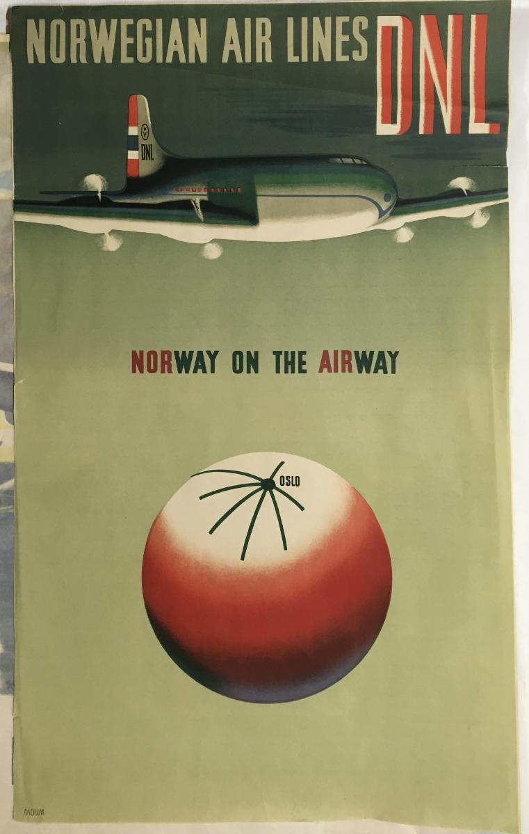 Litografi med färgad glob, Oslo i mitten, och flygplan.