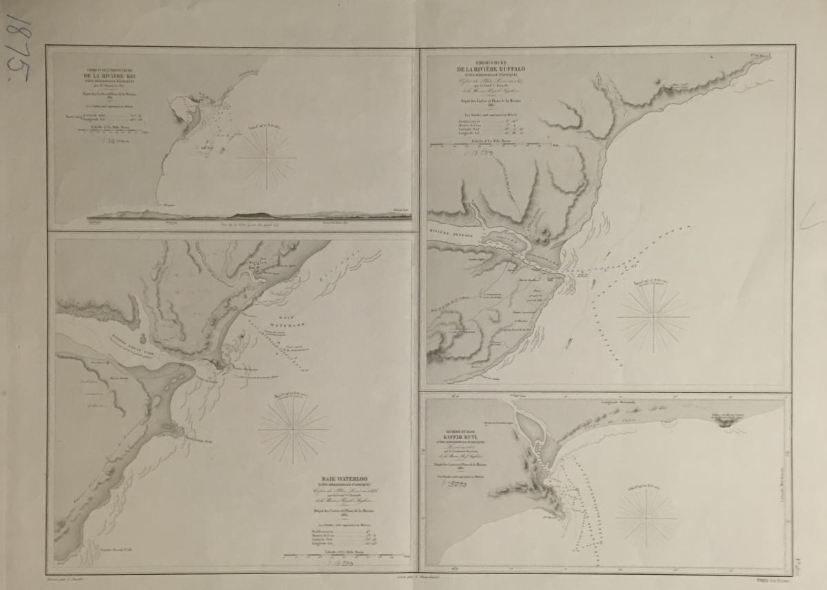 Sjökort, Buffelsrivier, Sydafrika 1861. På franska 'De la Riviere Kei, Buffalo, Baie Waterloo, Kaffir Kuyl'