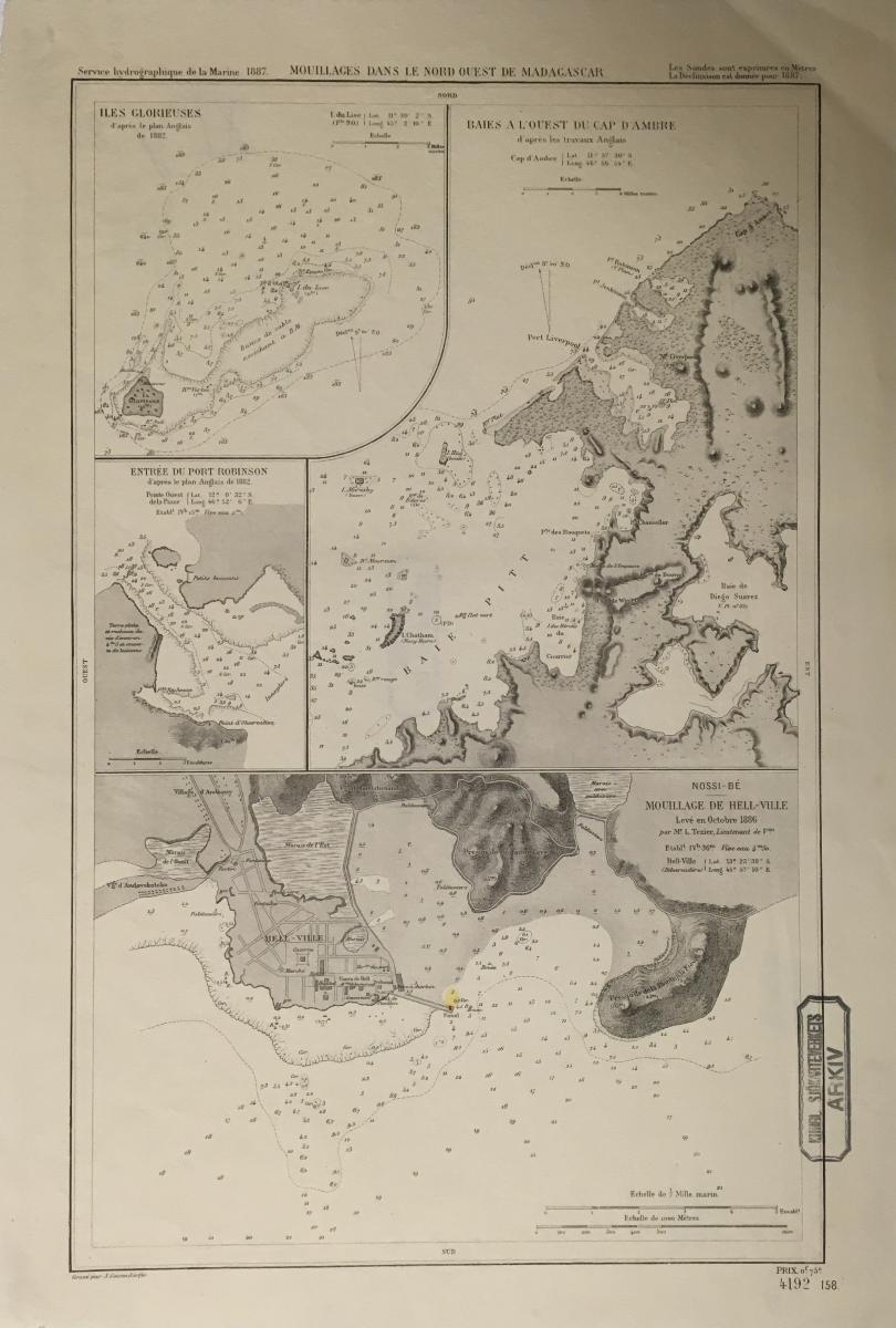 Sjökort, Madagaskar 1886. På franska 'Iles Glorieuses, Baies l'ouest du cap d'ambre, Entre 'port Robinson, Mouillage de Hell-ville'