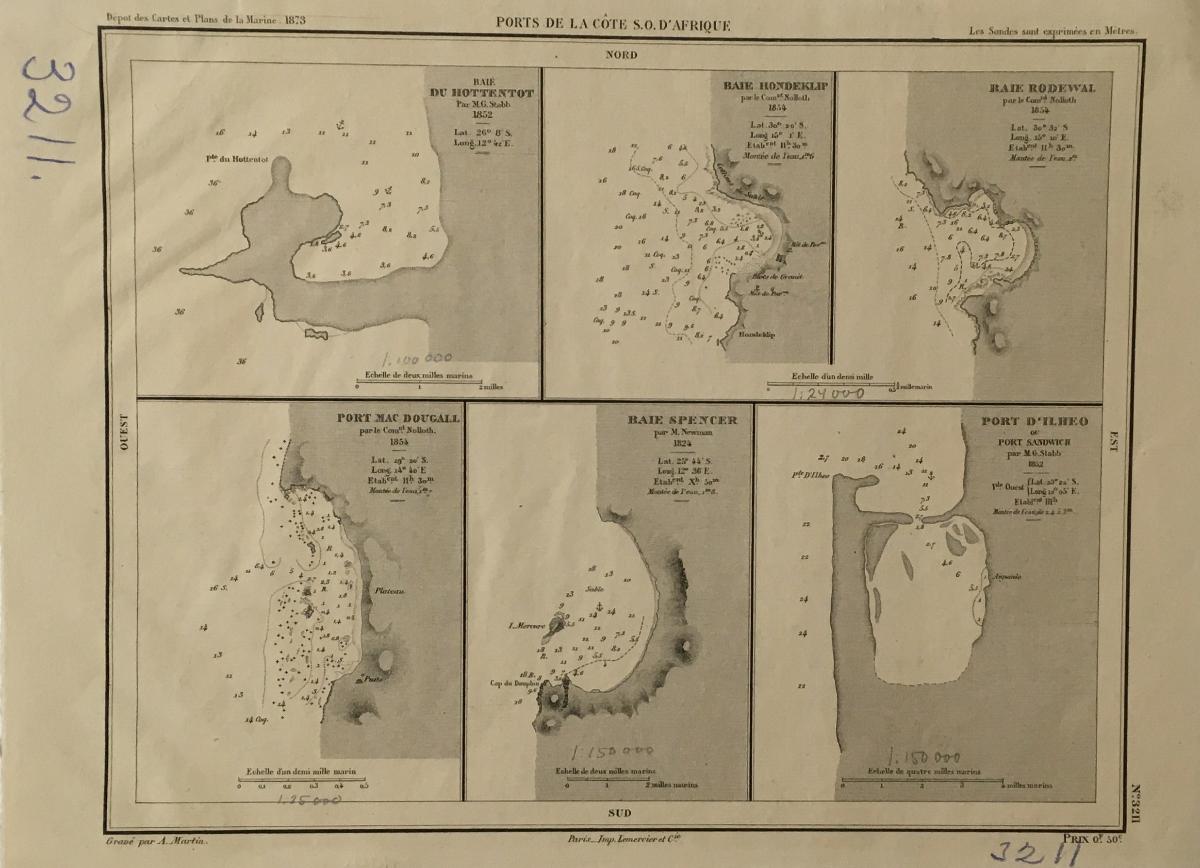 Sjökort, Hamnar på den sydvästra Afrikas kust 1873. På franska 'Ports de la Cote S.O. D'Afrique'