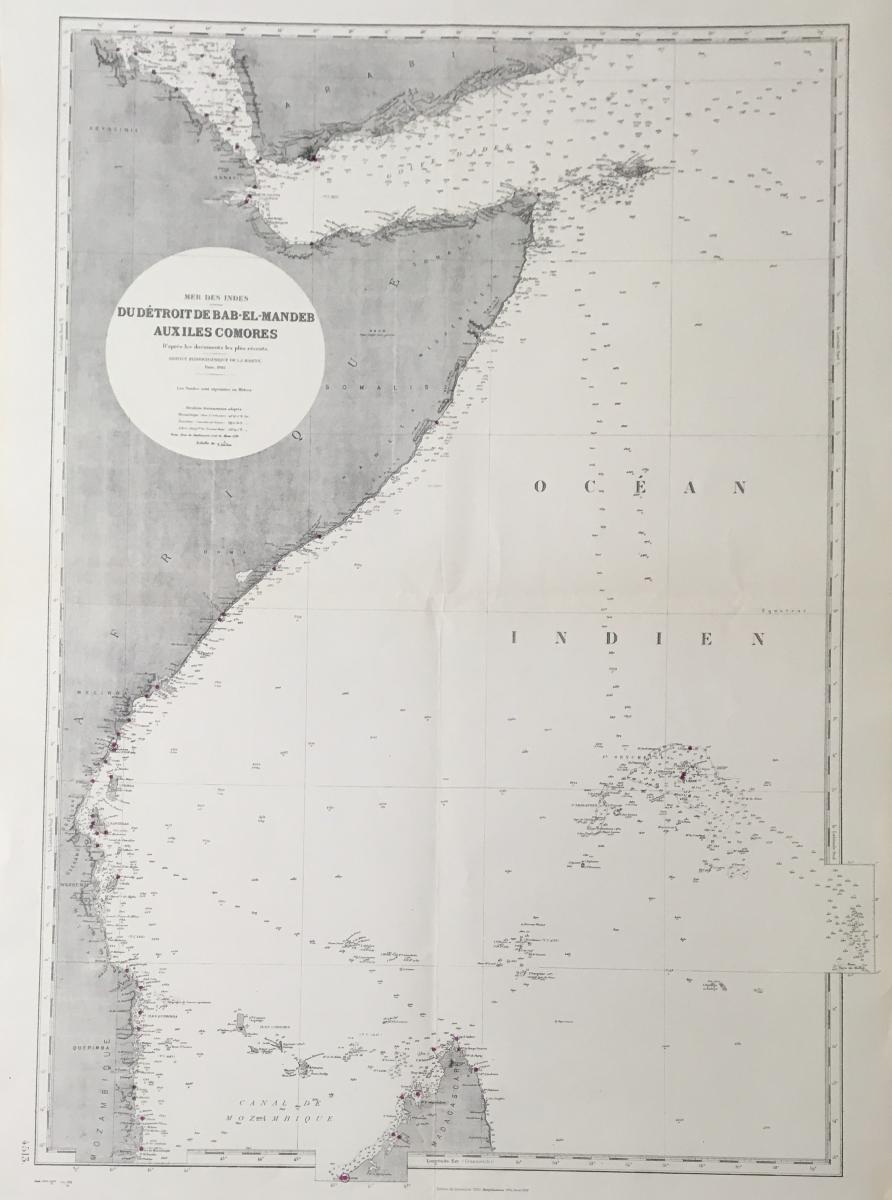 Sjökort, Indiska oceanen 1892. På franska 'Du D'etroit de Bab-el-Mandes Auxilles Comores'