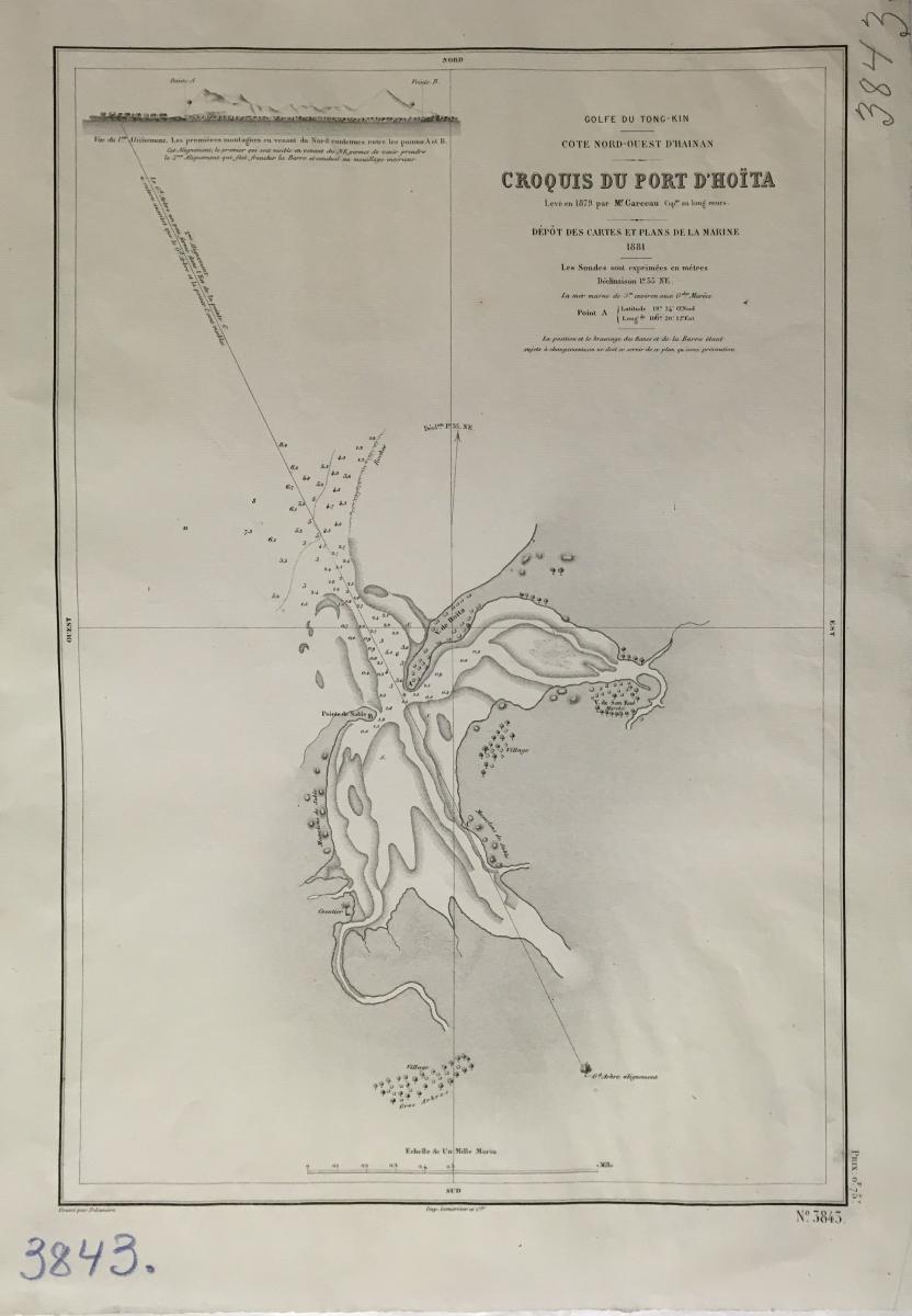 Sjökort, Tonkinbukten är en del av Sydkinesiska havet och gränsar till Vietnam i väster och Kina i norr., Kina 1881. På franska 'Croquis du port D'Hoita'