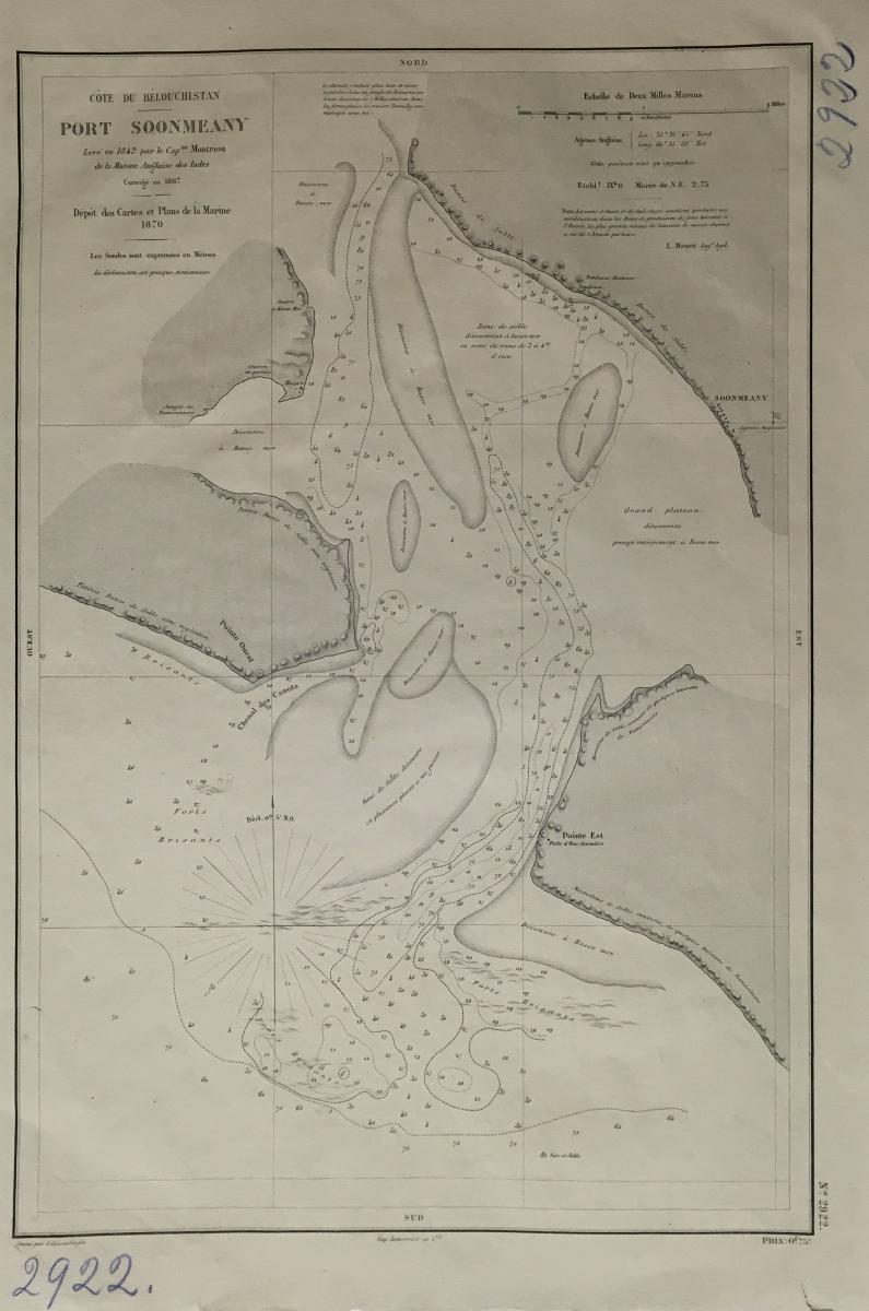 Sjökort, Balochistan, Pakistan 1870. På franska 'Port Soonmeany, Cote du Belouchistan'