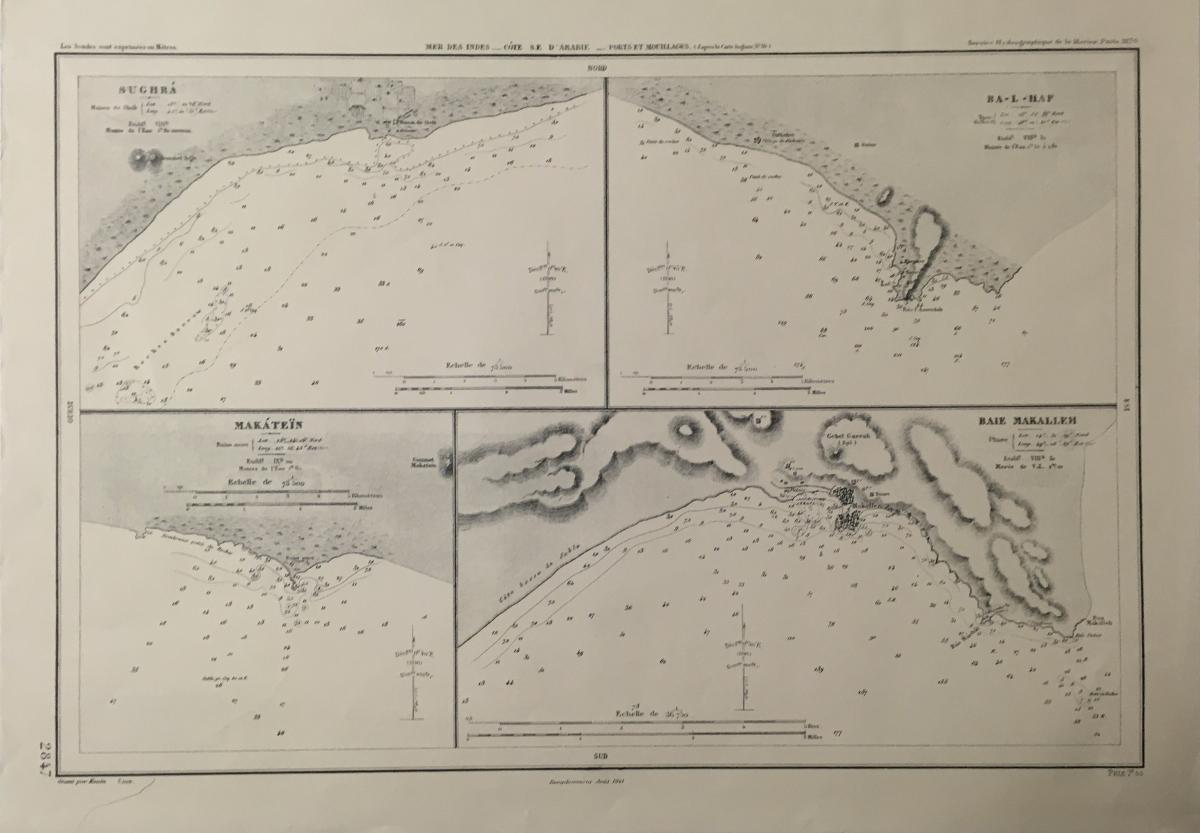 Sjökort, 1870. På franska 'Mer des Indes - Cote S.E D'Arabie, Sughra, Makatein, Ba-L-Haf, Baie Makalleh'