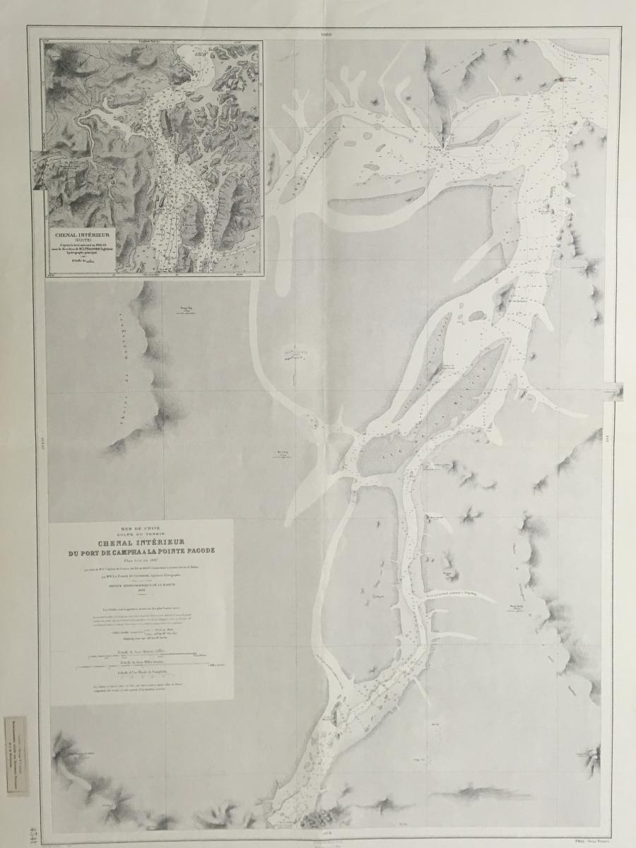 Sjökort, Pointe de la Pagode, Vietnam 1886. På franska 'Chenal Interieur Du Port de Campha a La Pointe Pagode'