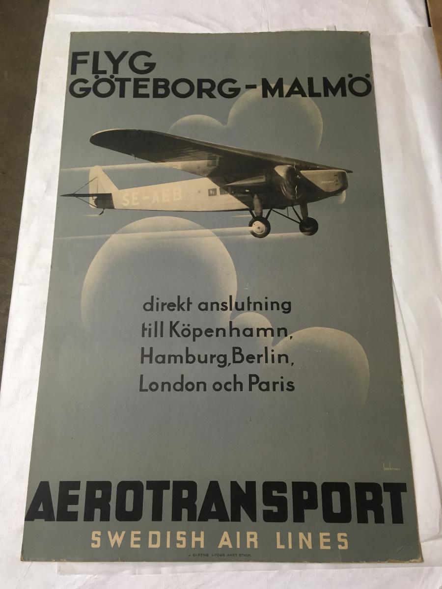 Tryck: Flyg Göteborg - Malmö, direkt anslutning till Köpenhamn, Hamburg, Berlin, London och Paris. Aerotransport Swedish Air Lines.