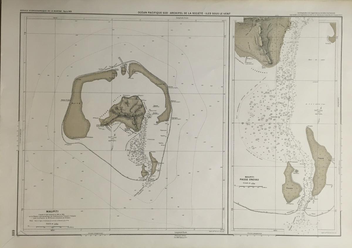 Sjökort, Sällskapsöarna 1823. På franska 'Ocean Pacifique Sud, Archipel de la Societe, Iles Sous le Vent'