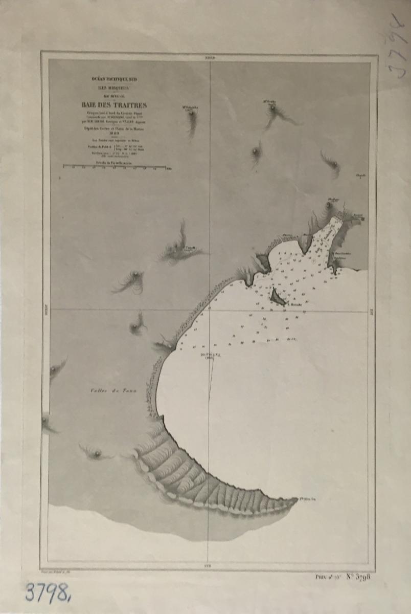 Sjökort, Ta'a Oa (Taʻa ʻOa), Vik i Franska Polynesien 1880. På franska 'Baie des Traitres'