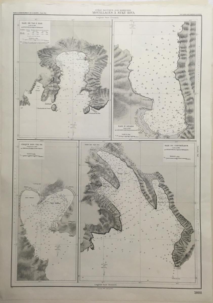 Sjökort, Nuku Hiva en ö i Franska Polynesien 1948. På franska 'Mouillages A Nuku Hiva'