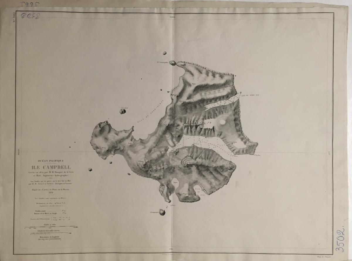 Sjökort, Campbell Island / Motu Ihupuku är en obebodd subantarktisk ö i Nya Zeeland 1876. På franska 'Ile Campbell'