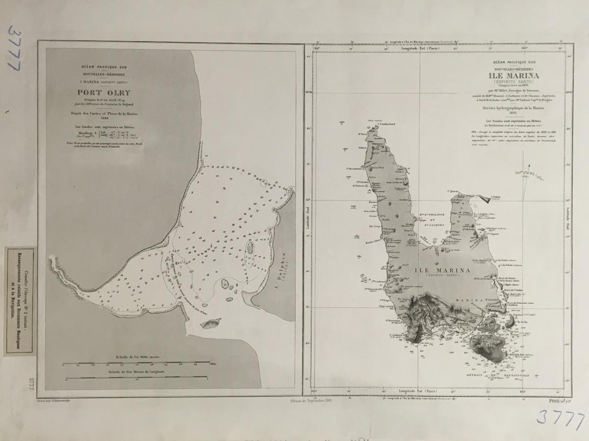 Sjökort, Nya Hebriderna är en ögrupp som var ett brittisk-franskt kondominatområde i Stilla havet 1892. På franska 'Nouvelle-Hebrides, Port Olry, Ile Marina'