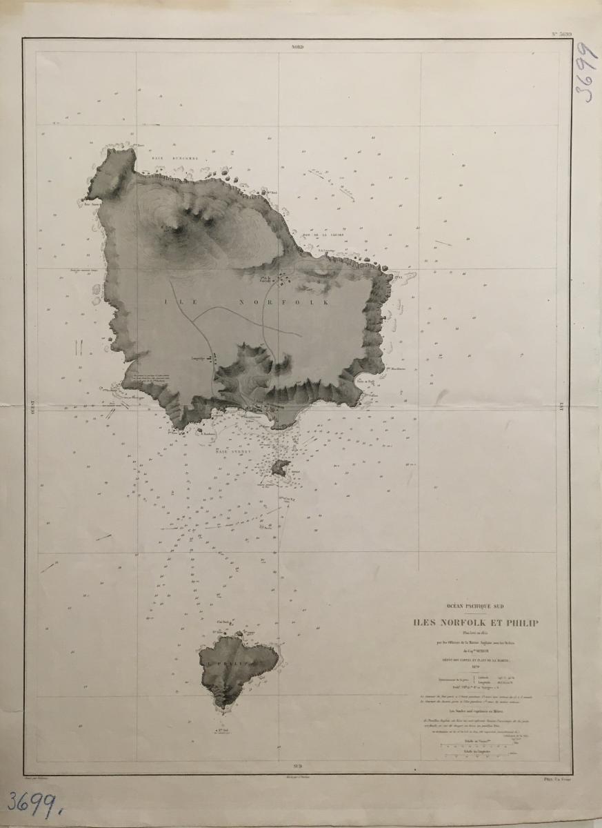 Sjökort, Phillip Island är en del av Norfolköarna 1879. På franska 'Iles Norfolk och Philip'