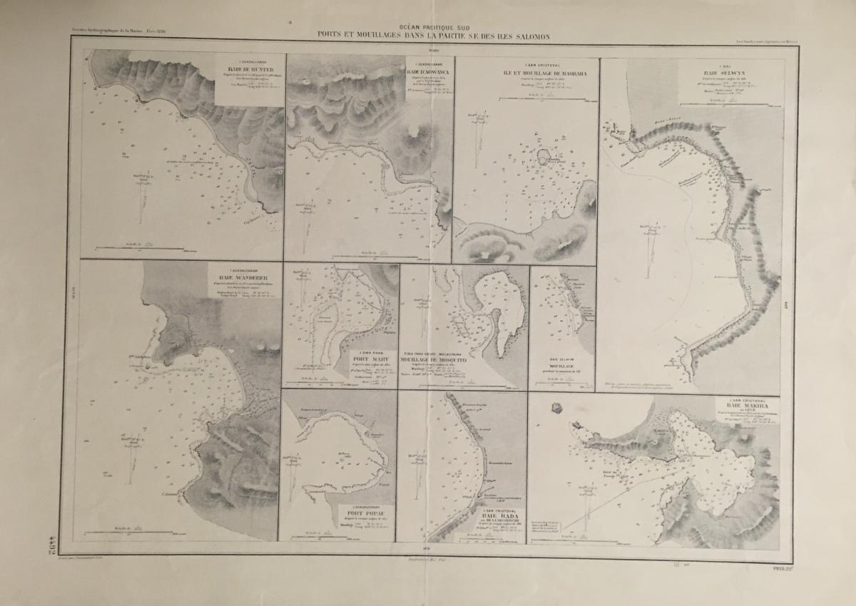 Sjökort, Salomonöarna 1890. På franska 'Ports et Mouillages dans la partie S.E Des Iles Salamon'