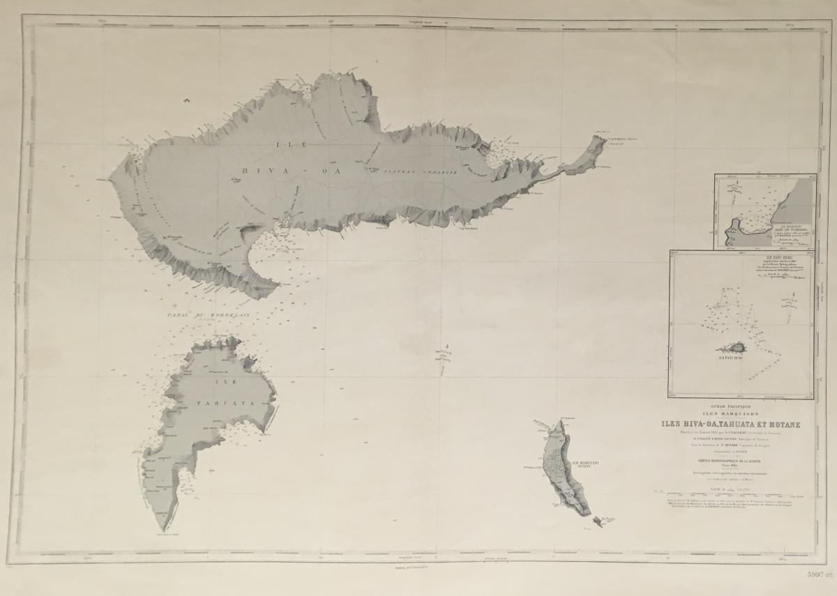 Sjökort, Marquesasöarna är ett av de fem territorierna i Franska Polynesien i Stilla havet 1884. På franska 'Iles Marquises, Iles Hiva-Oa, Tahuata et Motane'