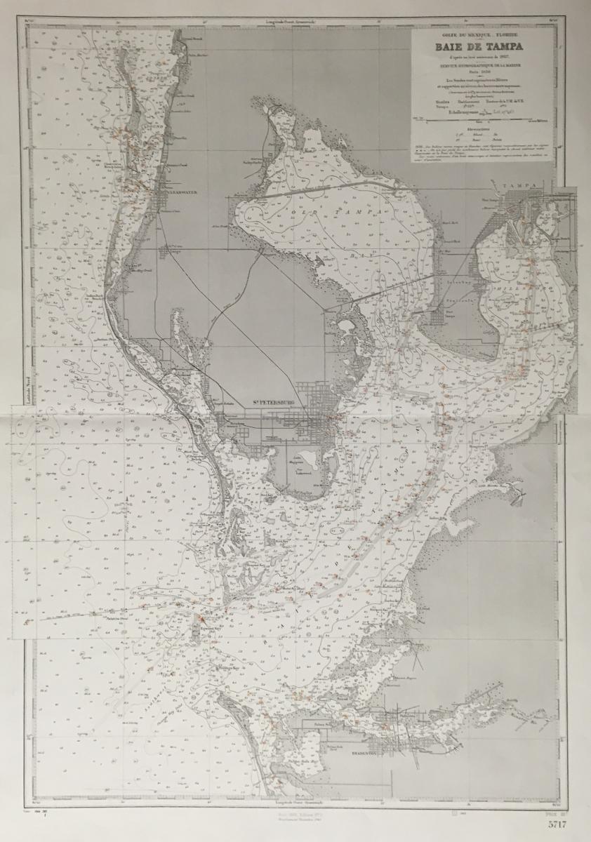Sjökort, Tampa Bay, Mexikanska golfen på Floridas västkust i USA 1930. På franska 'Baie de Tampa, Golfe du Mexique'