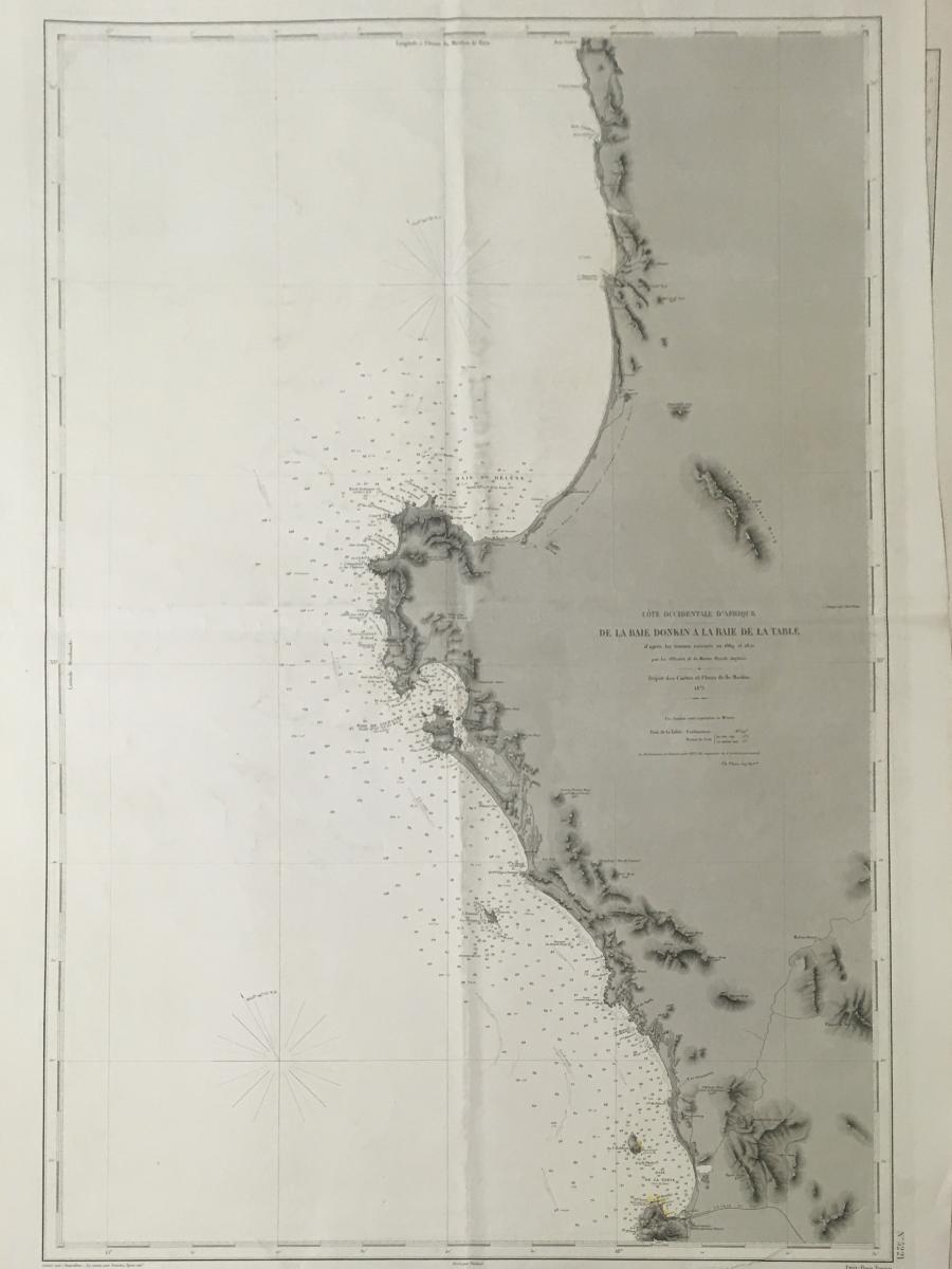 Sjökort, Västafrikas kusten 1873. På franska 'Cote Occidentale D'Afrique, De la Baie Donkin a la Baie de la Table'.