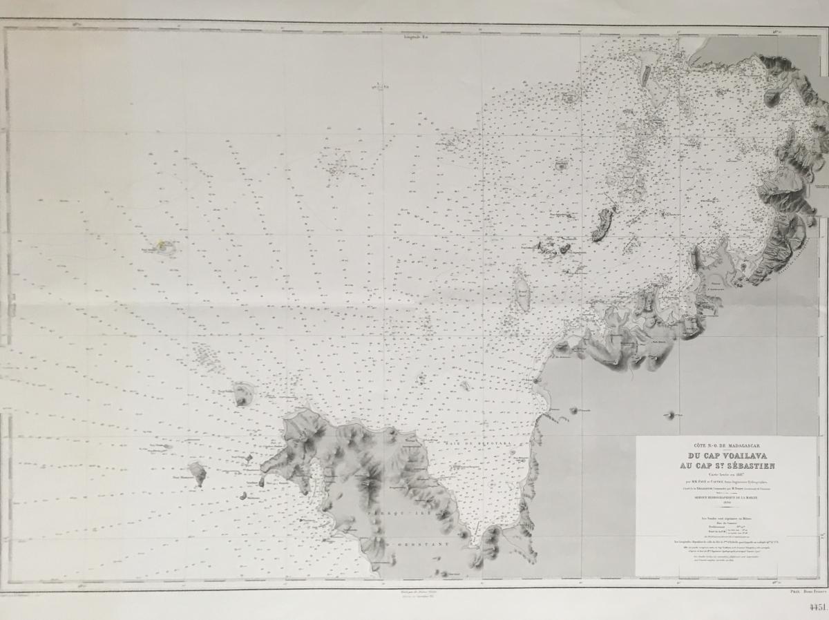 Sjökort, Madagaskar 1890. På franska 'Du Cap Voailava au Cap St. Sebastien'.