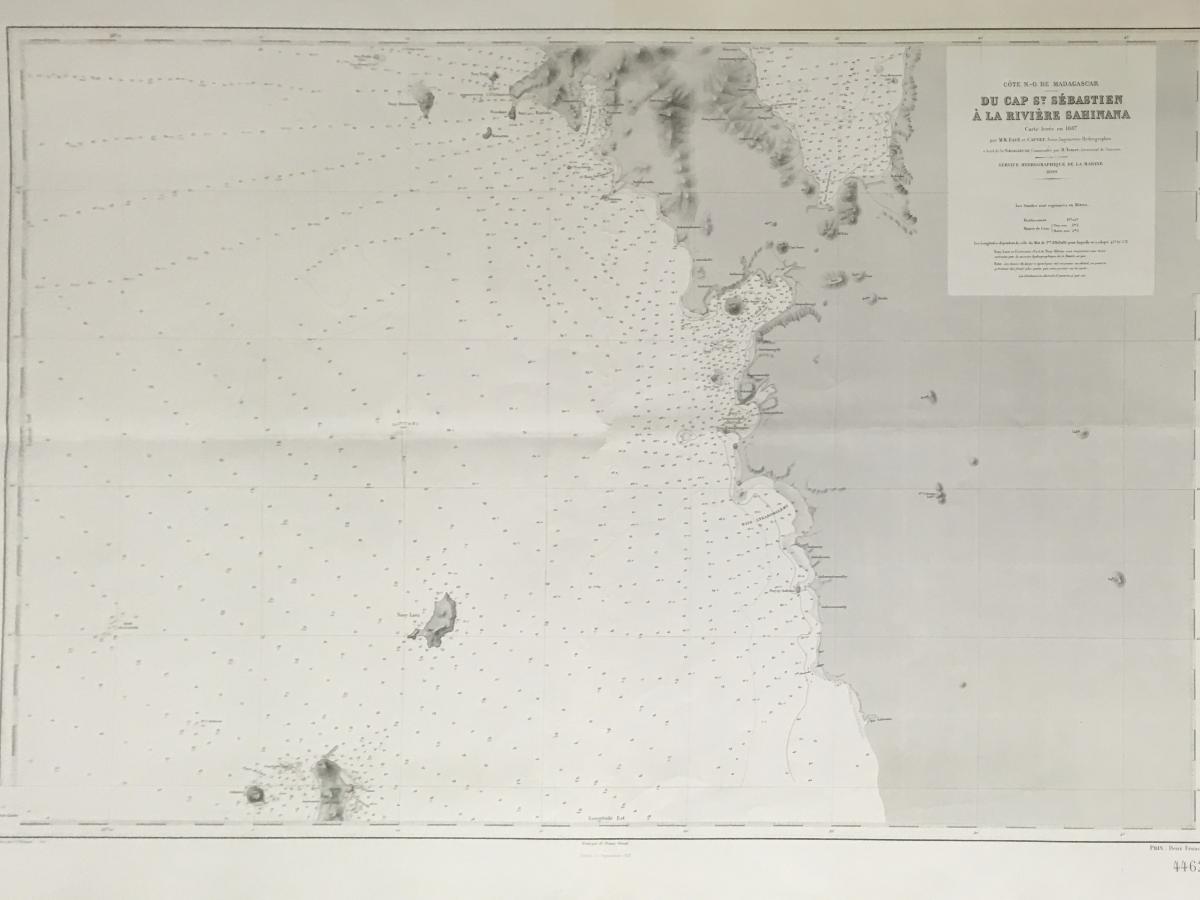 Sjökort, Madagaskar 1890. På franska 'Du Cap St. Sebastien a la Riviere Sahinana'.