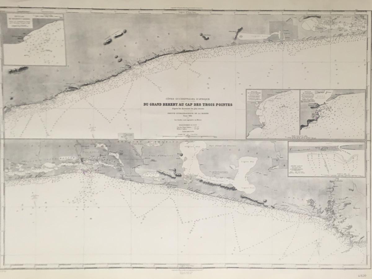 Sjökort, Grand-Béréby, 1894. På franska 'Du Grande Bereby au Cap des Trois Pointes'.