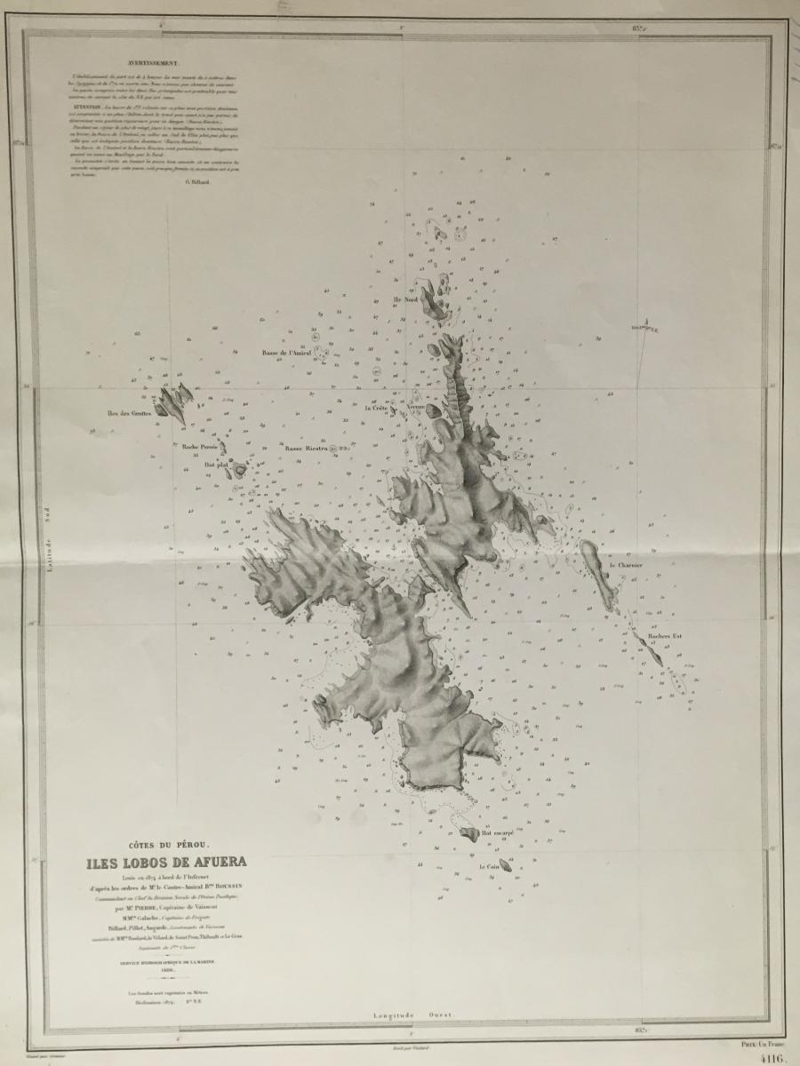 Sjökort, Islas Lobos de Afuera, Peru, 1886. På franska 'Cotes du Perou, Iles Lobos de Afuera'.