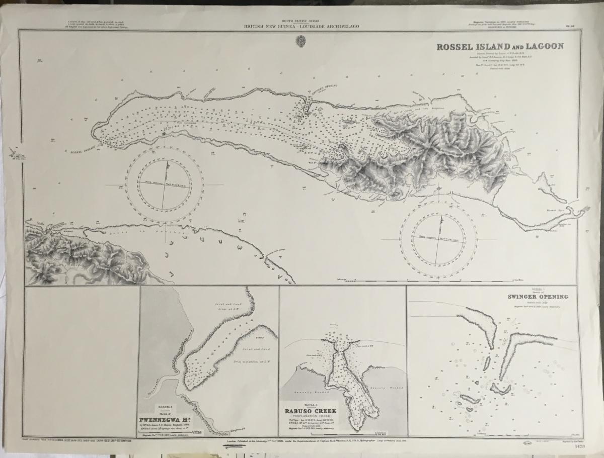 Sjökort, British New Guinea (historiskt land) 1890. På franska 'Rossel Island and Lagoon'.