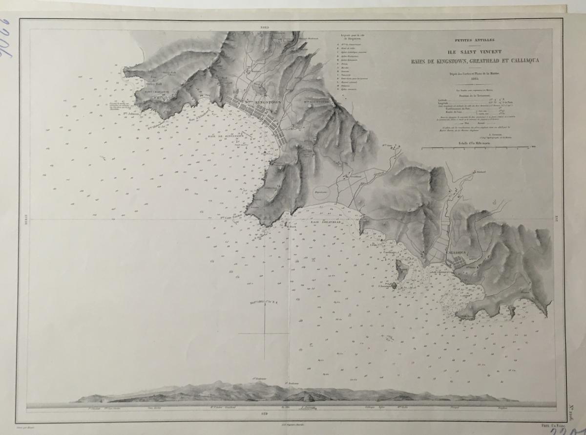 Sjökort, Saint Vincent, Västindien 1865. På franska 'Ile Saint Vincent, Baies de Kingstown, Greathead et Calliaqua'.
