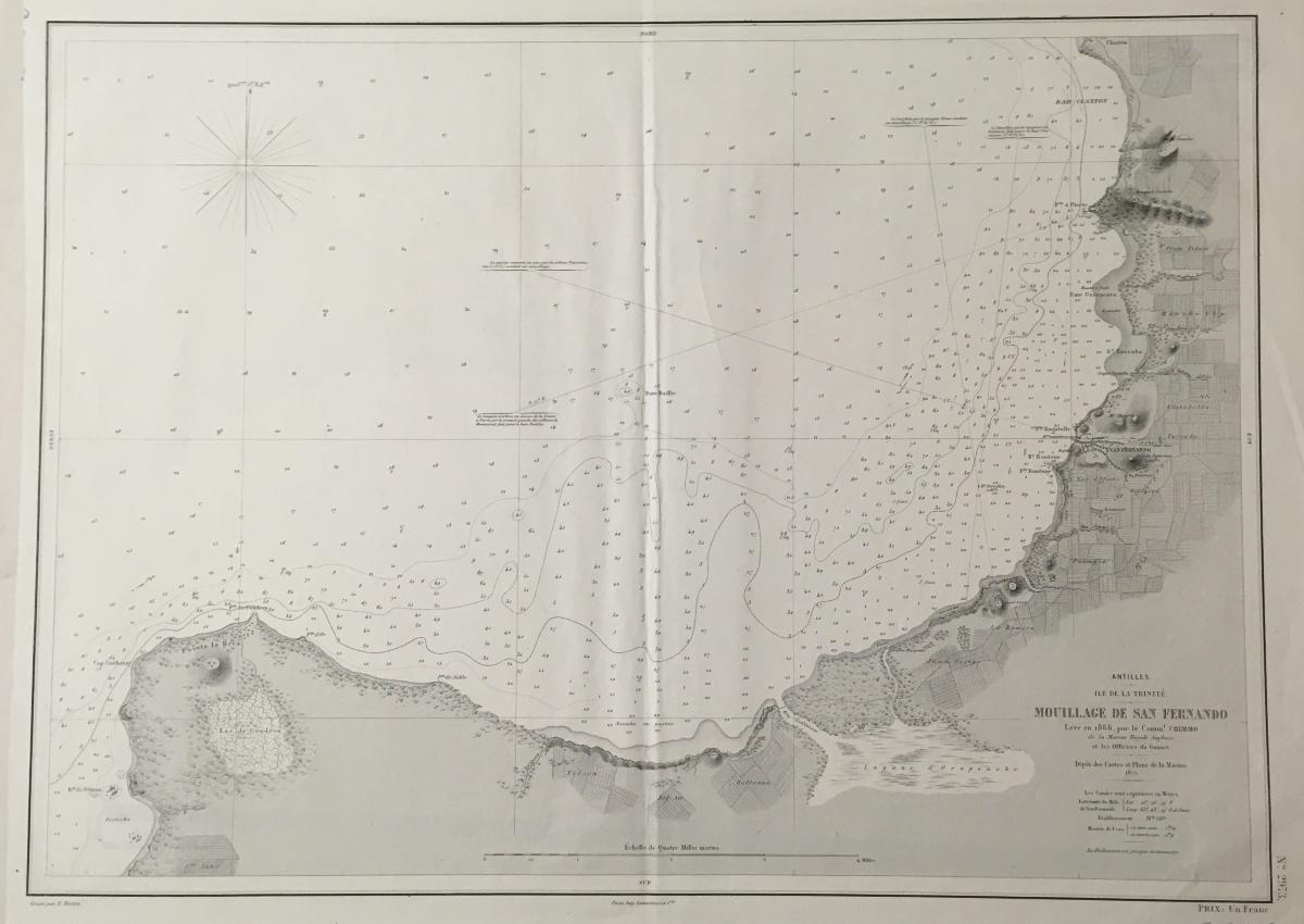Sjökort, Trinidad, Västindien 1871. På franska 'Mouillage de San Fernando, Ile de la Trinite'.