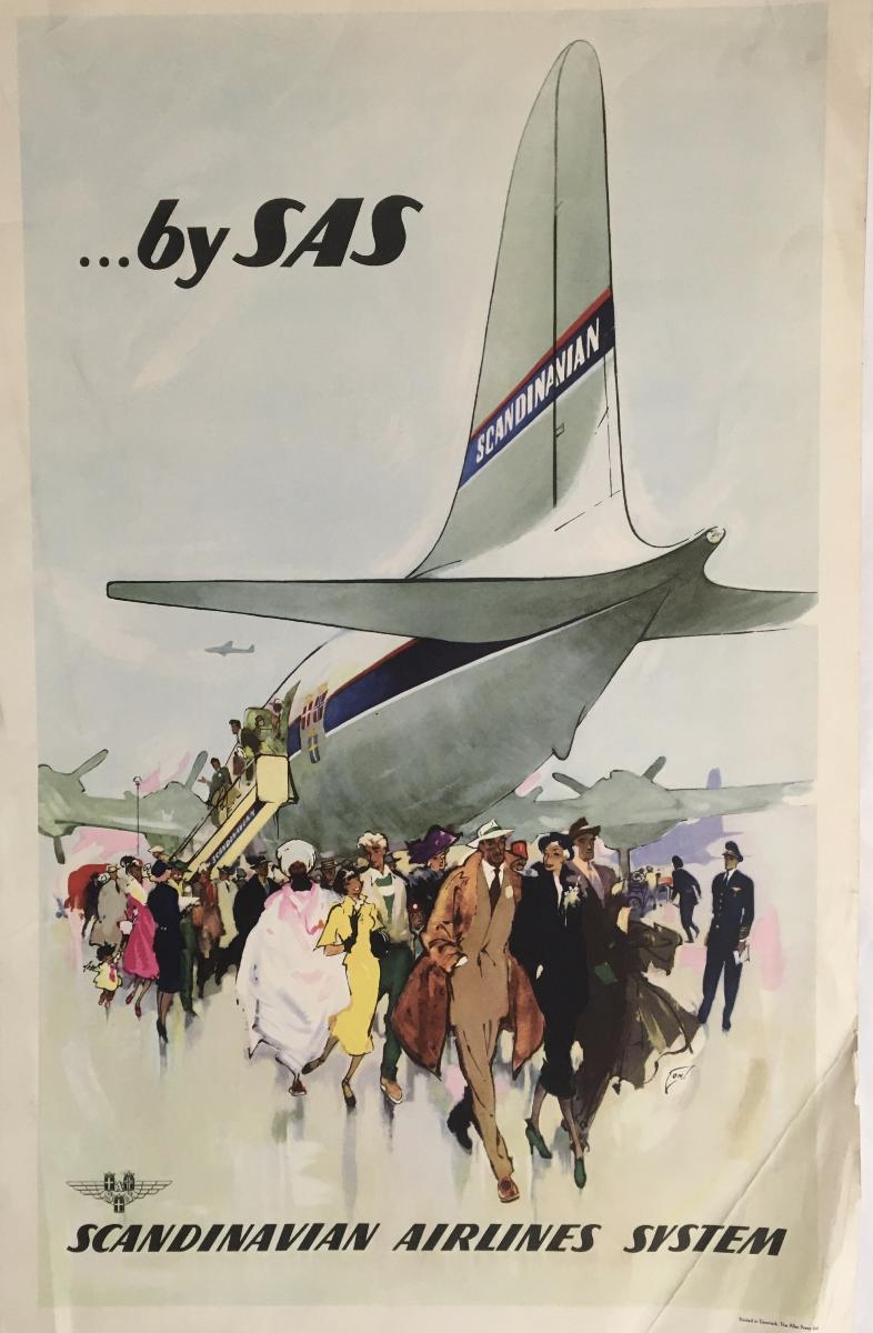 Litografi i färg föreställande människor som lämnar flygplanen 'Scandinavian'.