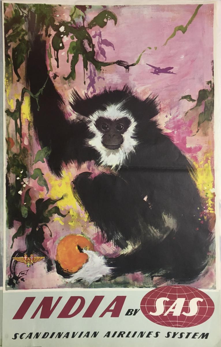 Litografi i färg föreställande langur apa. Ritad av Otto Nielson. Tryckt i Danmark av Al-Offset, Andreasen & Lachmann, Copenhagen.
